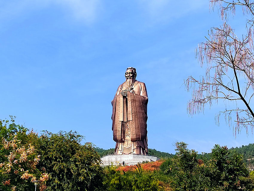 我們第一站就到了尼山圣境。尼山圣境位于山東省曲阜市東南25公里處的尼山下,背靠尼山,面朝尼山水庫,風(fēng)景絕美。尼山是中國(guó)先哲孔子的誕生地。在尼山圣境景區(qū),我對(duì)高聳入云的孔子像印象極深,據(jù)說像高72米,全用紫銅塑成,是世界上最大最高的孔子像,親臨其境仰望,我不只看到了“萬世師表”四個(gè)大字,還聞到了錢的味道。不過我對(duì)塑像的外觀還是比較滿意的,聽說是按照吳道子繪制的孔夫子像為藍(lán)本設(shè)計(jì)的,“可親、可敬,師者、長(zhǎng)者、尊者”。